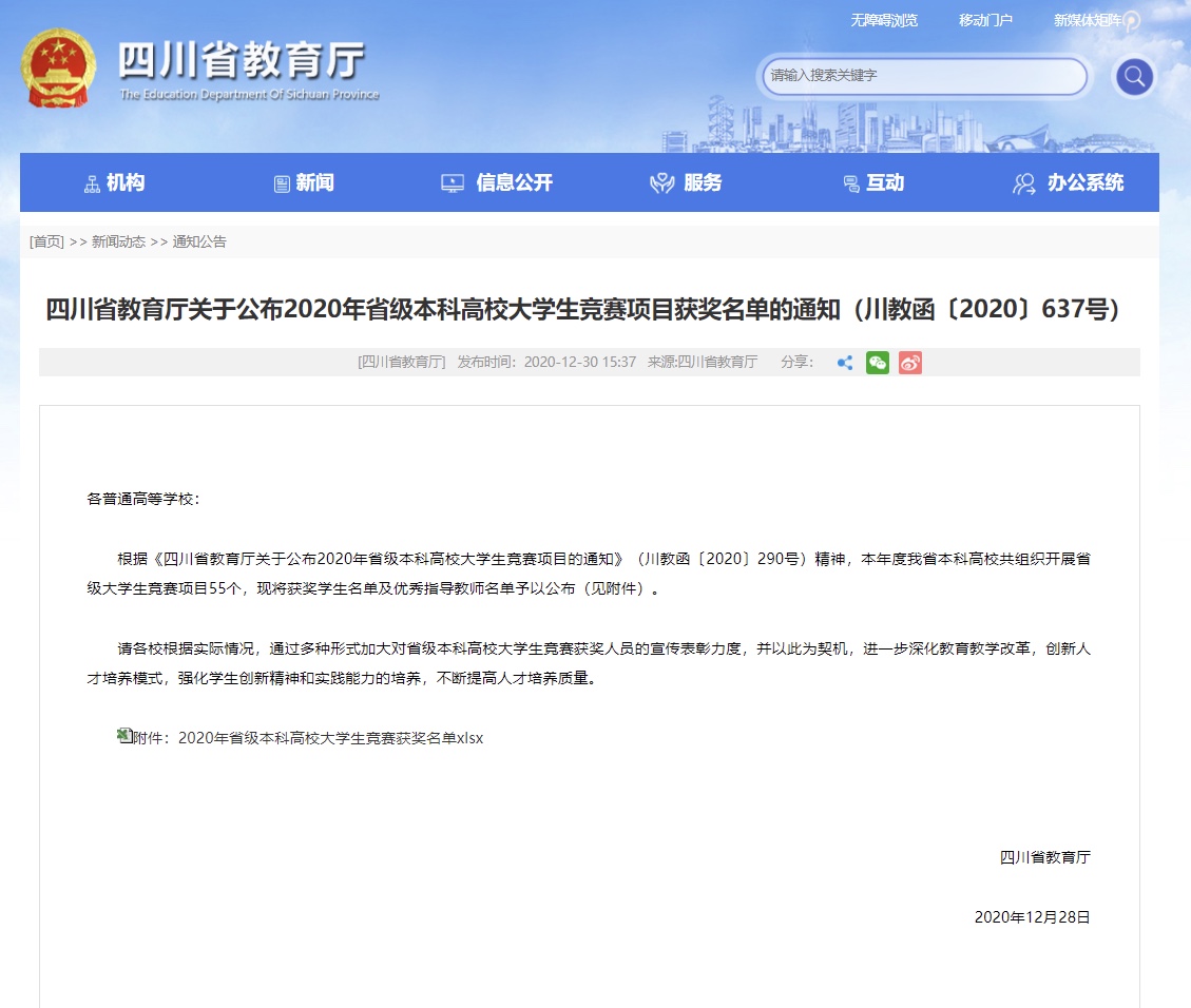 12月31日,2020年四川省大学生原创动漫大赛评审结果在四川省教育厅和四川省本科高校竞赛平台官网上陆续公布,十大信誉网赌学生取得佳绩,获得一等奖1项、二等奖2项、三等奖9项,南京、刘婉毅获得“优秀指导老师”。