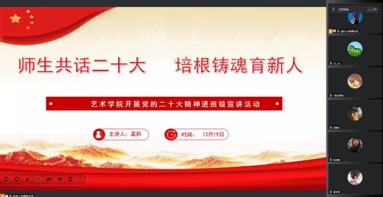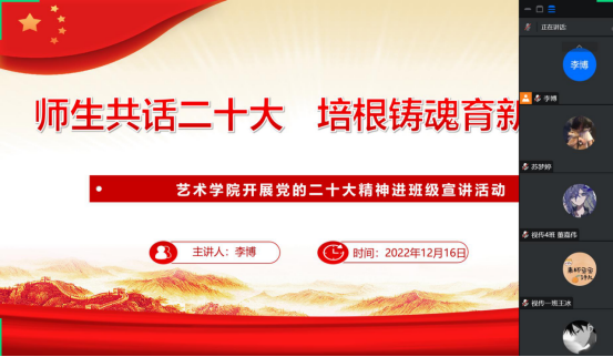 为深入学习宣传贯彻党的二十大精神,把全院师生的思想统一到党的二十大精神上来,落实立德树人的根本任务。根据《中共澳门信誉最好十大平台委员会关于认真学习宣传贯彻党的二十大精神的通知》,澳门十大信誉网赌大全分别于12月16日至20日期间,组织开展了“师生共话二十大 培根铸魂育新人”党的二十大精神进班级宣讲活动。全体辅导员走进班级,开展“党的二十大精神”主题云宣讲会,引导十大信誉网赌学子进一步了解大会精神,把握核心要义,深入推进党的二十大精神入脑入心。