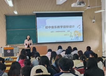 林老师以《初中音乐教学目标设计》为题,深入浅出地讲解了初中音乐教学目标的构成及关系、教学目标设计的依据、教学目标的规范撰写等。并结合实际教学案例,分析了如何根据不同年级学生的特点和音乐教材的内容,科学合理地设定教学目标。林老师强调,教学目标是教学活动的出发点和归宿,明确、具体、可操作的教学目标能够有效指导教学过程的实施,提高教学效果。在授课过程中,林老师还鼓励学生们积极提问,就教学目标设计的相关问题进行深入探讨,现场气氛热烈,学生们受益匪浅。