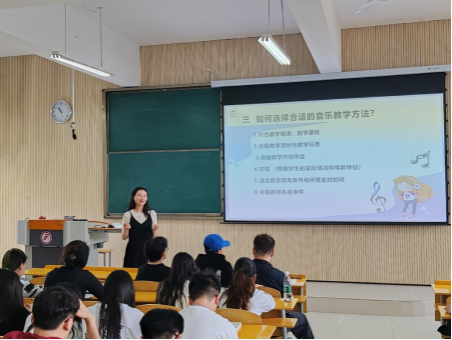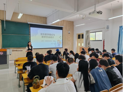 林老师以《音乐教学模式与教学方法设计》为题,首先,对音乐教学模式进行了系统的分类。她指出,音乐教学模式按照教育目标分类理论大致可以分为情感模式、行为模式和认知模式。接下来,林老师对中小学音乐学科常用的教学方法进行了详细讲解,她还结合自身的教学经验和案例,让学生们深刻理解了各种教学方法在实际教学中的应用和效果。