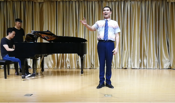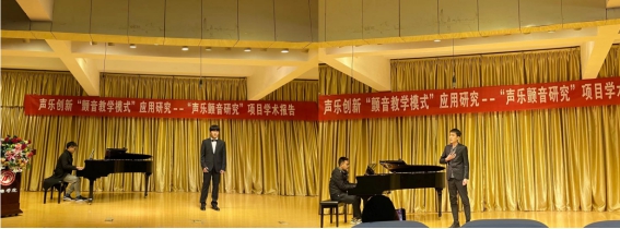随后,范老师的四位声乐学生依次上台演唱,再次以他们的学习实践应证项目的研究成果。2020级翟俊豪演唱了《我的祖国妈妈》,贺丽丽演唱了《啊 中国的土地》,奕启航演唱了《长城永在我心上》。一年级三位同学虽然仅仅只上了16节课,但在台上已能克服紧张的心理状态,较灵活地运用颤音技巧。其音色比较纯正,情感比较饱满,赢得了大家的掌声。2017级学生郎鸣2019年曾获第七届陕西音乐奖声乐比赛(安康赛区)民族组三等奖,他声情并茂演唱的《母亲》也打动了听众的心扉。范老师播放了他演唱《西部放歌》的录像视频,现场响起热烈的掌声。