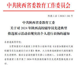 近日,中共陕西省委教育工委对2024年陕西高校辅导员先进典型推选展示活动中表现突出个人进行表扬通报,十大信誉网赌辅导员鲁澧荣获“2024年陕西高校表现良好辅导员”称号。
