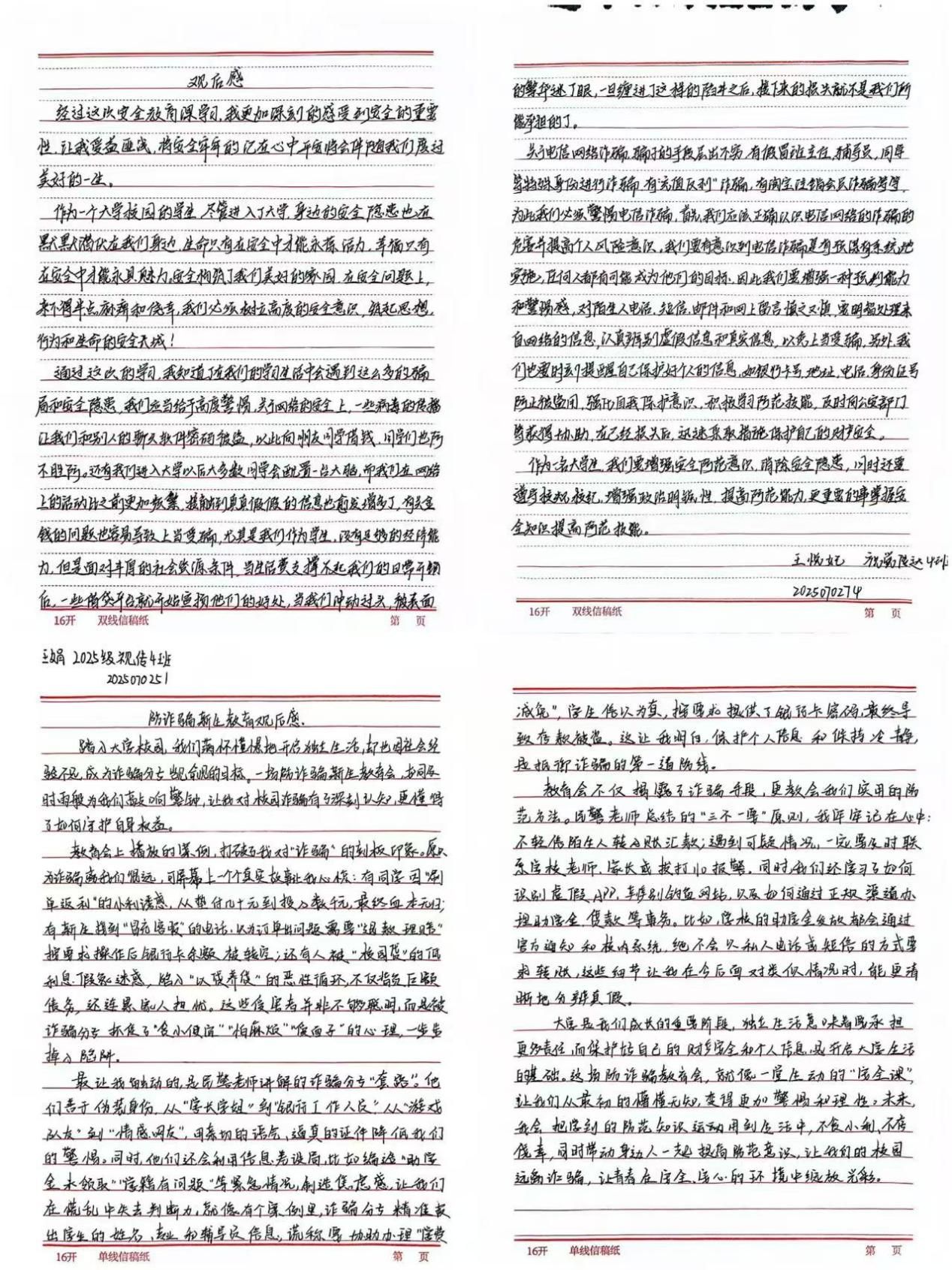 系列活动尾声,学院鼓励新生结合线上课堂所学与班会讲解内容,撰写个人心得体会。同学们在文中分享对电诈危害的新认知、防骗技巧的新掌握,字里行间满是参与活动的真实感悟,也标志着此次反诈教育真正入脑入心。