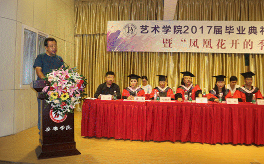 美术系教师老教师周平老师全体教师在毕业典礼上发言,发言中,他深情的回顾了与同学们相处的点点滴滴,祝愿同学们今后都要坚持自己的梦想,坚持学习,坚持从实际出发。他告诉大家:今天的典礼不是道别,而是猛士出征前的誓师;不管你们使用哪般兵器,选择哪条道路,时空变迁,总会在未来的某一个节点再聚安大,母校永远欢迎大家常回家看看。