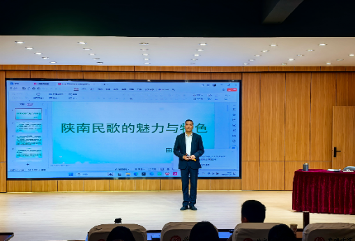 11月8日上午,师生在1401演艺厅聆听了镇巴县文化馆非遗中心主任国家级非遗项目镇巴民歌省级代表性传承人——田洪涛的讲座讲座从历史渊源、语系、题材等方面对陕南民歌进行总结概括,认为陕南民歌浩如烟海、内容繁多、体裁丰富,真实地反映了陕南人民的历史文化生活,是一部陕南人民历史变迁的活化石。讲座中,田主任对镇巴民歌如数家珍,且讲、唱结合,富有理论研究和实践演唱功底,给大家带来非同一般的享受。