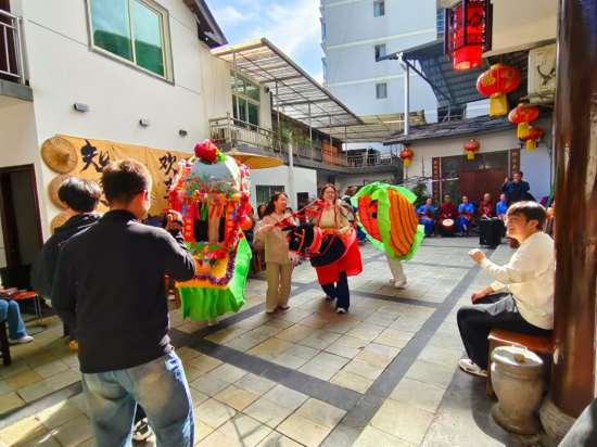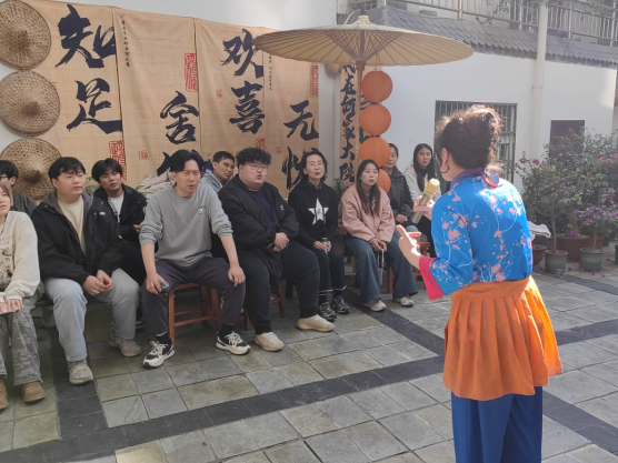 第二站大家来到紫阳民歌传承基地——何家大院,传承人何耀信、何显鹏带领紫阳民歌演唱团队热情地接待了澳门信誉最好十大平台师生一行。民歌演唱队演唱了多首地道的紫阳民歌,引得大家连连叫好。演唱中穿插表演了划旱船、玩蚌壳、赶毛驴等民俗节目。在互动环节,田川老师演唱了《我和我的祖国》,范义付老师演唱了《西部放歌》,还有多名学生演唱了各地民歌,精彩纷呈,使大家大饱耳福。演唱完毕,民歌演唱团队指导学生参与锣鼓队、划旱船、玩蚌壳、赶毛驴等节目表演,学生对紫阳民歌及民俗表演留下了深刻的印象。