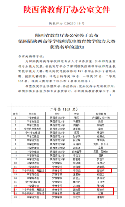 近日,第四届陕西高等学校师范生教育教学能力大赛在咸阳师范学院举行,十大信誉网赌2021级音乐学专业李圣杰、2022级音乐学专业简吉雪、2022级美术学专业张婉玉三位同学凭借扎实的专业知识、出色的教学设计和现场表现,在众多参赛者中脱颖而出,成功进入决赛并荣获二等奖。
