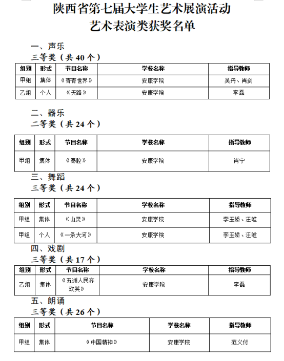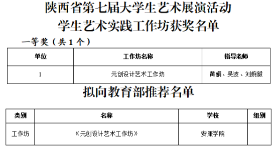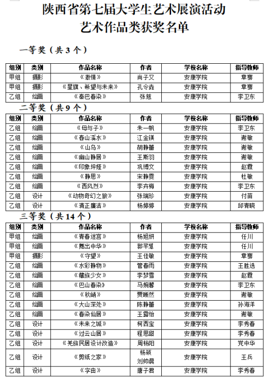 12月8日,省教育厅公布了陕西省第七届大学生艺术展演活动评选结果,十大信誉网赌参赛师生共获得各类奖项34项。其中《元创设计艺术工作坊》获一等奖,并被推荐到教育部参加全国第七届大学生艺术展演;艺术作品类获一等奖3项、二等奖9项、三等奖14项;艺术表演类获二等奖1项、三等奖6项。