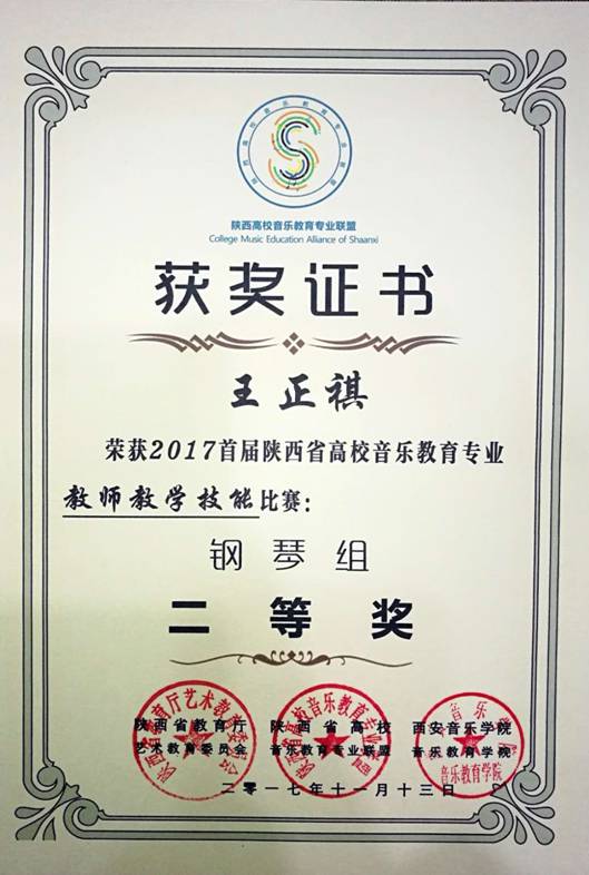 11月13日,十大信誉网赌田川、王正祺老师在陕西省教育厅艺术教育委员会主办、西安音乐学院音乐教育学院承办的“2017首届陕西省高校音乐学专业教师教学技能比赛”中分获声乐组一等奖和钢琴组二等奖,体现了十大信誉网赌音乐专业教师在全省高校中良好专业素质和教学能力。