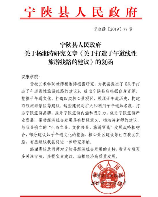 近日,十大信誉网赌收到宁陕县人民政府关于杨湘涛副教授《关于打造子午道线性旅游线路的建议》的复函,肯定了杨老师提出的建议。复函表示部分建议已经实施,有些建议将进一步研究采纳,希望澳门信誉最好十大平台今后更多关注宁陕,多提宝贵建议,助推县域经济高质量发展。