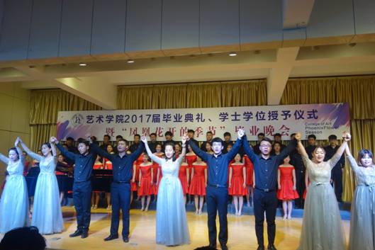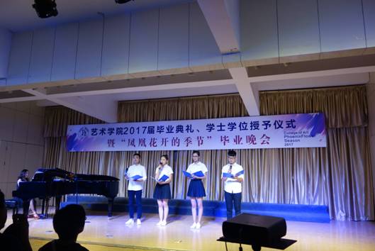 院学生会干部原创的诗朗诵《凤凰花开的路口》,勾起了2017届毕业生对四年生活的回忆,四年前,大家相遇相知,温暖胸膛、怀揣梦想;四年里,大家共同努力,激越青春、欢乐成长;四年后,即将天各一方,各自打造梦想的天堂,不要让泪水打湿容颜,火热激情即将绽放当晚,让我们的心于空中翱翔,在青春的蓬勃下生长,在岁月流光中温暖启航。