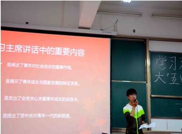 活动开始,由美术学13级2班、4班的团支部书记王壮楠和武杰同学对五四讲话的主要内容进行传达。在北京大学师生座谈会上,习近平总书记用八个字亲切地评价了当代大学生,那就是“可爱,可信,可贵,可为”。同学们听到习近平总书记的评价,备受鼓舞,学习热情高涨。