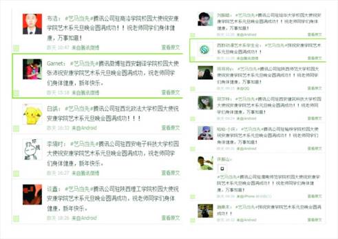 现场腾讯微博互动。我们的晚会得到了腾讯公司的大力支持,在晚会现场,陕西师大、西安交大、西安电子大学等高校通过腾讯微博都纷纷发来贺电,预祝艺术系“艺马当先”元旦晚会圆满成功,这是我们起初没有预想到的,进一步扩大了十大信誉网赌的社会影响,不得不感慨微时代的辐射力和影响力。现场观众的微博互动更为晚会增添许多的乐趣。微博的滚动抽奖也为现场的六名观众带来的新年的幸运。