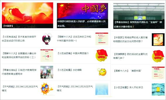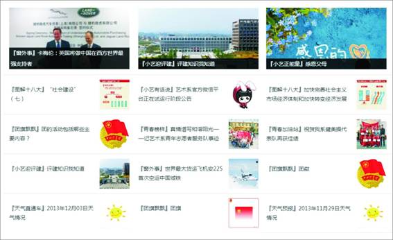艺术系微信公众平台经过长达两个多月的申请和准备,于1125日国家工信局审核通过,现在正式开通,我系团总支正进行试运行和调整。目前初步形成了十个栏目,分别是《窗外事》、《图解十八大》、《中国梦专栏》、《团旗飘飘》、《小艺迎评建》、《小艺正能量》、《青春榜样》、《青春加油站》、《微语时刻》和《天气直通车》,拥有微信好友粉丝700多人,收到文字或语音等形式的留言近百条,并逐步成为继我系班级博客、微薄、班群之后引领团员青年成长又一重要新媒体阵地。作为大学生喜闻乐见的新媒体传播方式,我们以服务广大团员青年成长成才为宗旨,以宣传时政要闻、社会热点、团情时讯和校园文化活动为重点,宣传报道大学生身边的优秀典型及事迹,围绕大学生活中的时尚、流行等元素加强与团员青年的互动交流,致力于全面构建具有青年特色、时代特色和专业特色的网络青年工作服务体系。