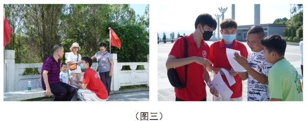 团队成员在到达牛蹄岭战斗遗址公园后,对参观纪念碑的游客进行调研问卷发放与采访,调研游客对于此战斗遗址公园的建设意见和红色文创产业发展的建议。图三左侧这位长辈是已经年过六旬,在采访时他说:“我的父亲曾经是一位老红军,他参加过很多战斗。所以我对这些革命前辈都怀有无比崇高的敬意,每年都要来牛蹄岭参观数次,当时那个战役牺牲了太多人。现在有了儿媳和孙子,每年带他们来参观是因为不想让现在的好日子麻痹他们,要让他们知道咱们现在的好日子是来之不易的,没有这些先辈的流血牺牲,就没有如今的好日子。我现在就希望呀,把这个战斗遗址纪念碑广场这块再搞好一点,要不然都没人来。”