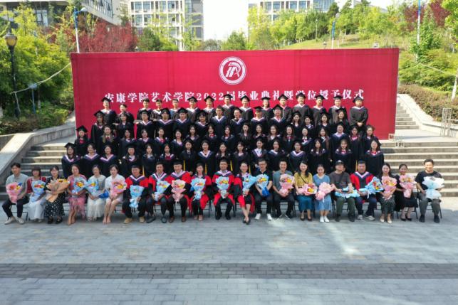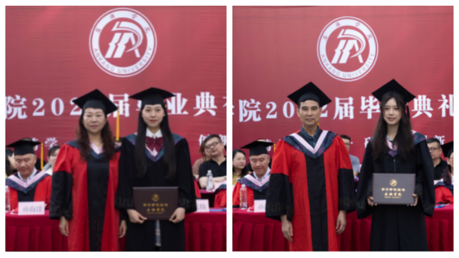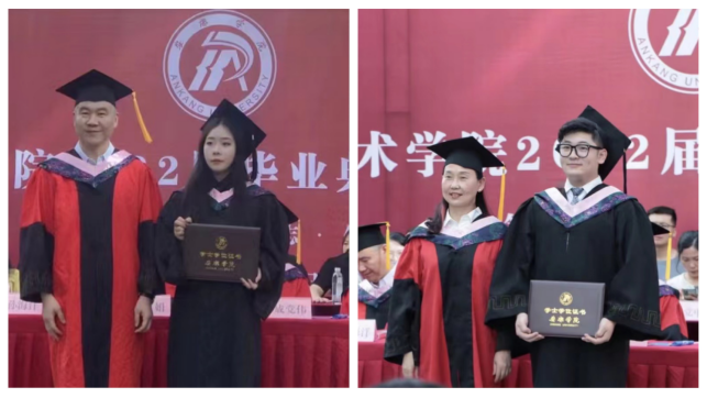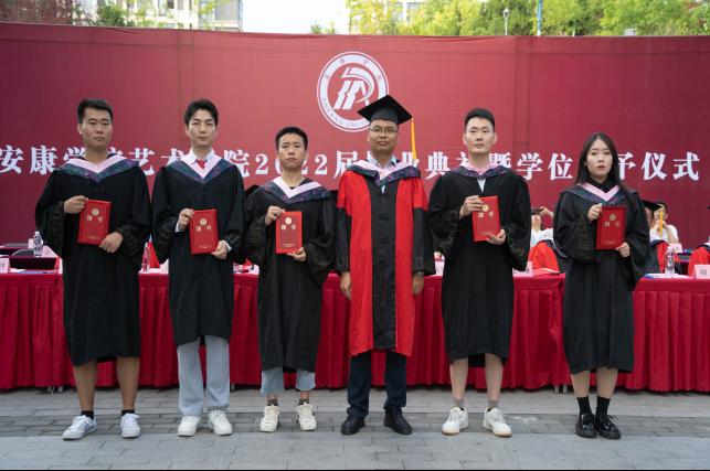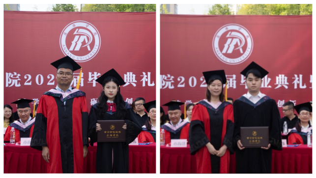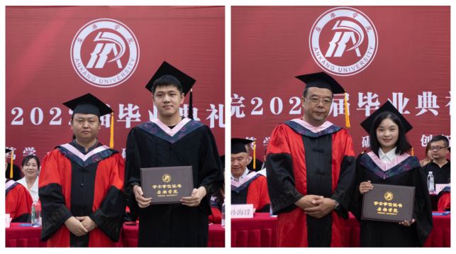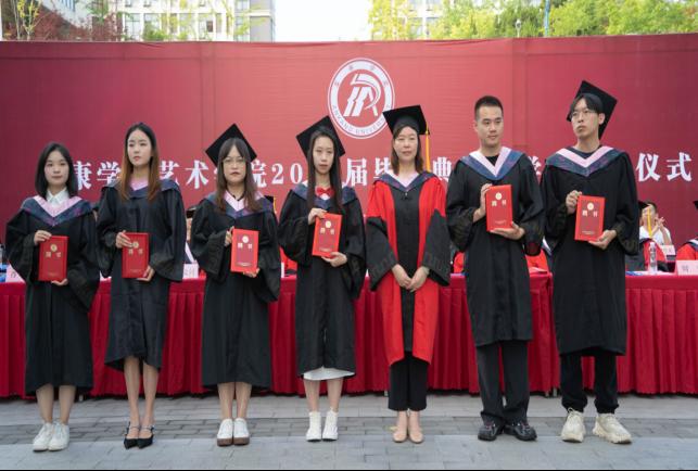 伴随着歌声,学院院长成党伟教授和导师们为毕业生们一一正冠拨穗,颁发学位证书,并合影留念。