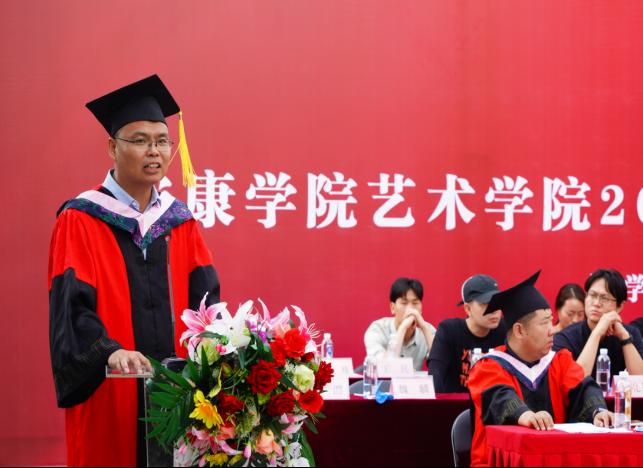院长成党伟在致辞中代表学院向圆满完成学业的毕业生表示热烈祝贺, 他讲到:2022届毕业生欣逢盛世,与时代共享荣光,见证了国家追光逐梦的发展历程。他对毕业生提出四点希望:一是希望同学们驻足理想、逐梦而行。胸怀家国,让青春在正确的道路上挥洒汗水;二是希望同学们胸怀格局、包容勇毅。在接纳中放大格局,在磨砺中提升境界,用宽广的胸怀热情拥抱美好的未来;三是希望同学们心向阳光,砥砺前行。把握青春时光,在砥砺前行的道路上成为更为优秀的自己;四是希望同学们保有本真、芳华永继。要用理性的视角、感性的情感去审视生活之美、人性之善,胸怀家国情怀,遵守社会公德,严守做人底线。