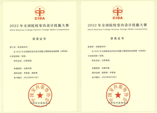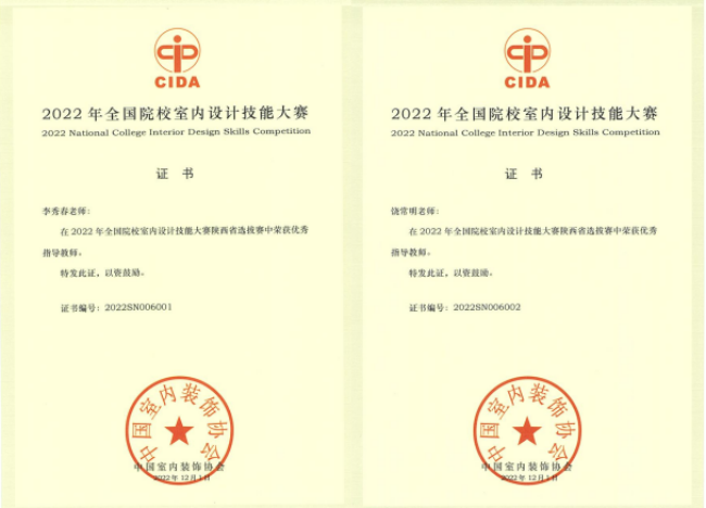 近日,2022年全国院校室内设计技能大赛(陕西赛区)比赛结果揭晓。由十大信誉网赌青年教师饶常明、李秀春指导的2020级视觉传达设计专业唐子君、张荟茹同学荣获本科组团体“一等奖”,并受邀参加国赛;2019级视觉传达设计专业张萌梦、郑森栋同学荣获本科组团体“三等奖”。饶常明、李秀春获本次大赛“优秀指导教师”。