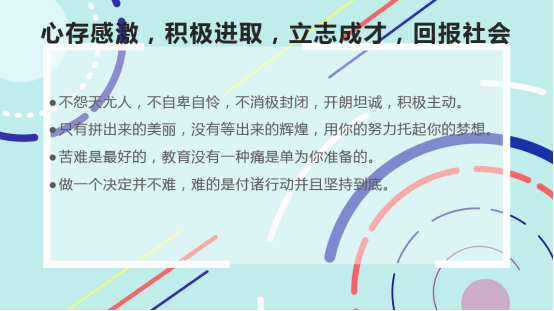 第二,广大受资助学生需更加合理、有效地使用奖助学金,以凸显国家资助政策的激励和育人功能,广大青年学子需心怀感恩、诚实守信、积极向上、励志成才。
