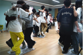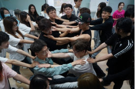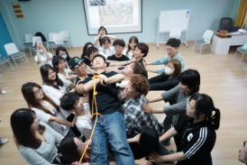 “诺亚方舟”4-5人一组,每组有三分钟的时间尝试单只脚站立在报纸上,并且另一只脚悬空,持续时间为10秒钟。报纸由平铺到对折再对折,用时最短即为获胜,获胜组可惩罚用时最长的一组。当“洪水”来袭时,“诺亚方舟”是唯一的安全地,同学们集思广益,相互配合,提高凝聚力,只有静心思考,通力合作,才能获救。“诺亚方舟”让同学们感受心灵的力量,形成团结一致,相互支持的团体。