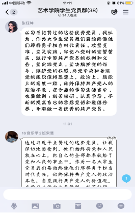 经验交流后,学生党员围绕《习近平点赞过的那些优秀共产党员》,发表自己的感想。学生党员曹博文讲到:“习近平总书记点赞的党员同志都是在各自的岗位上苦干实干,奋斗不止。我们要好好学习专业课知识,积极要求进步,努力提升自身的综合素质和工作能力,在工作中树立服务意识和法治意识,坚持好的工作作风,敢担当敢作为,以不畏艰难的勇气、坚忍不拔的意志,尽心竭力做好工作。”学生党员张岳峰谈到:“习近平总书记称赞的优秀党员,他们用美好青春诠释了共产党人的初心使命,谱写了新时代的青春之歌。作为学生党员,我们要时刻牢记自己的初心和使命,汲取优秀力量。”