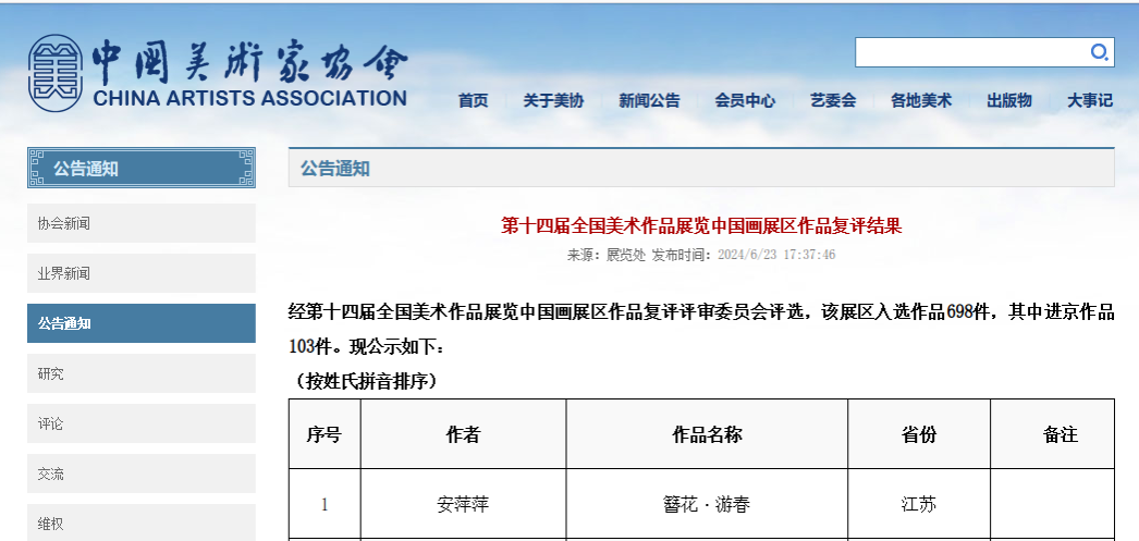 6月23日,中国美术家协会发布“第十四届全国美术作品展览中国画展区作品复评结果”,入选作品698件,十大信誉网赌章长青老师1件作品《高速时代》入选。