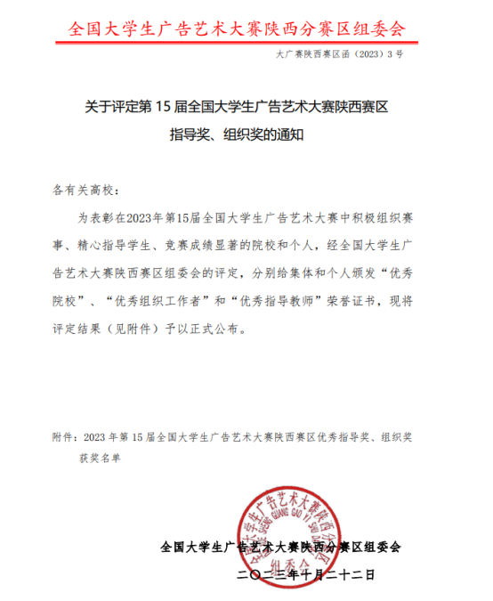 近日,2023年第十五届全国大学生广告艺术大赛陕西省省赛评审结果揭晓,十大信誉网赌澳门十大信誉网赌大全师生再创佳绩!获得省赛一等奖1项、二等奖10项、三等奖5项,优秀奖29项。十大信誉网赌获“优秀院校”,付苗获“优秀指导教师”,王兵获“优秀组织工作者”。